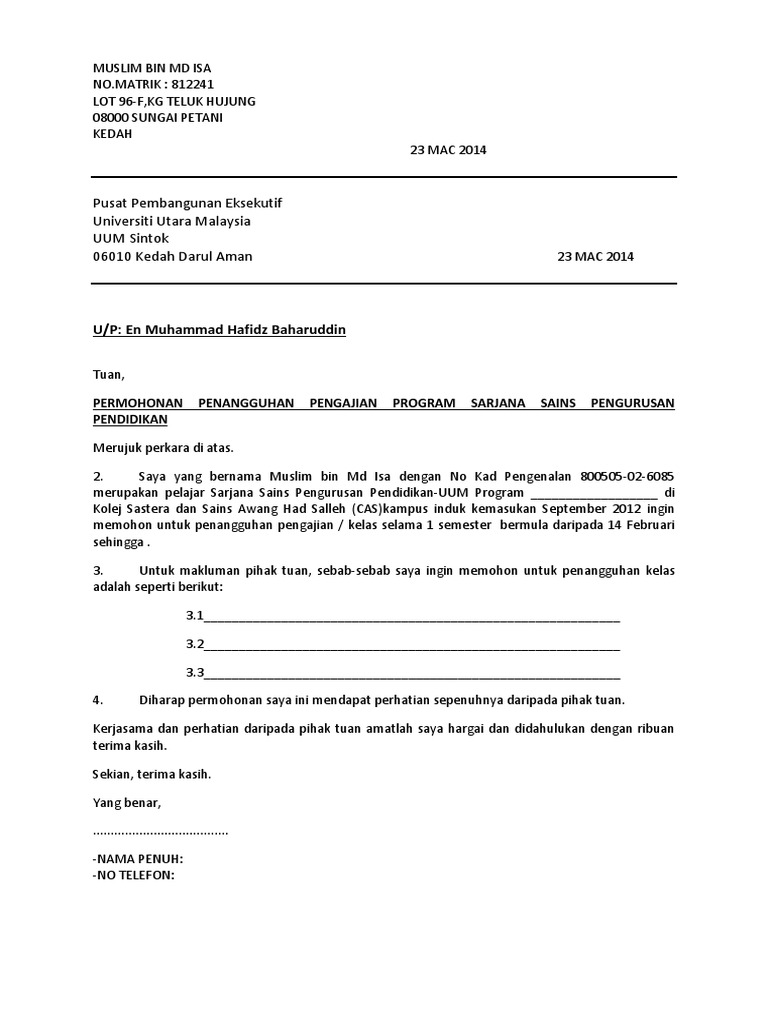 Tapak web bantuan penulisan saya mendapat lebih 2 juta lawatan setiap tahun. Penangguhan pengajian ijazah pada semester ini. Contoh surat tangguh pengajian semester.